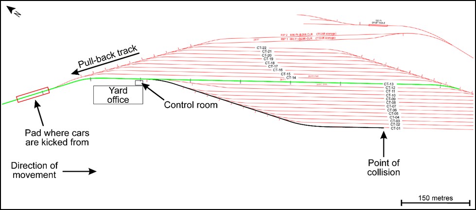 - The collision and derailment occurred when a knuckle on car CP 429137 failed while the cut of 75 cars was in motion, leading to the uncontrolled movement of 56 cars into the designated emergency track (CT-01).