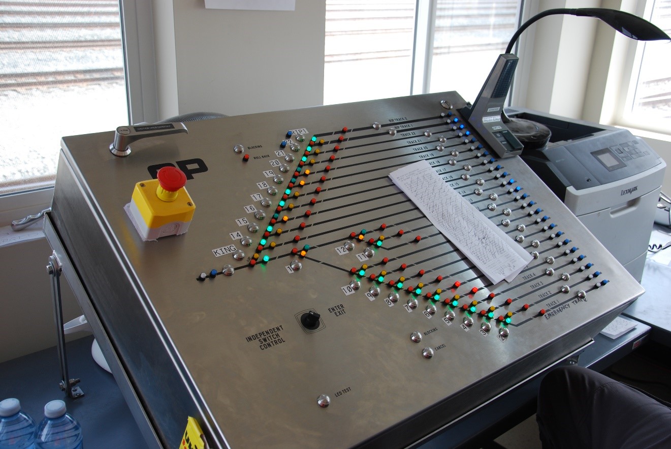 As the cars are released, the foreman informs the yard helper by radio. The yard helper, who is able to observe the car movement from the window in the control room and from the video feed from various cameras positioned throughout the C-Yard, then remotely activates the power switch for the desired track by way of the control panel (Figure 5). When the yard helper is informed of an uncontrolled movement, the cars are routed into the designated emergency track.