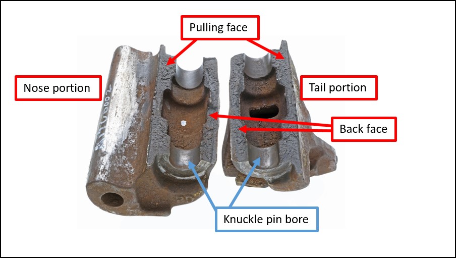 Knuckles found broken or with cracks are condemnable... Determination shall be by visual inspection and/or by utilizing non-destructive testing as defined in MSRP [Manual of Standards and Recommended Practices] M-220.Footnote 15