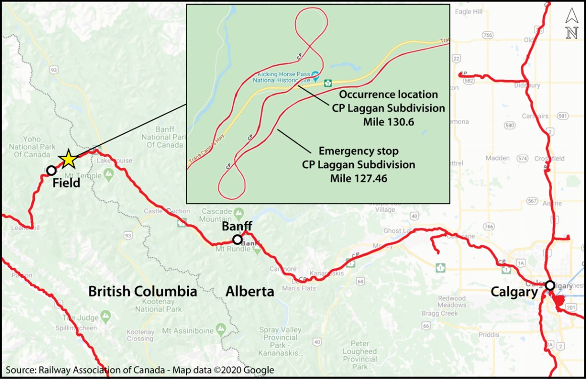 On 03 February 2019, Canadian Pacific Railway Company (Canadian Pacific or CP) freight train 301-349 was travelling westward on the Laggan Subdivision, which runs from Calgary, Alberta (Mile 0.0) to Field, British Columbia (BC) (Mile 136.6).