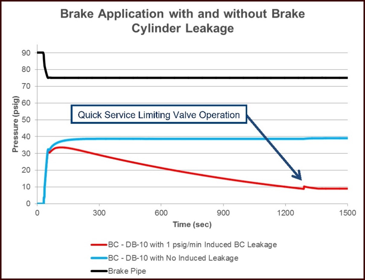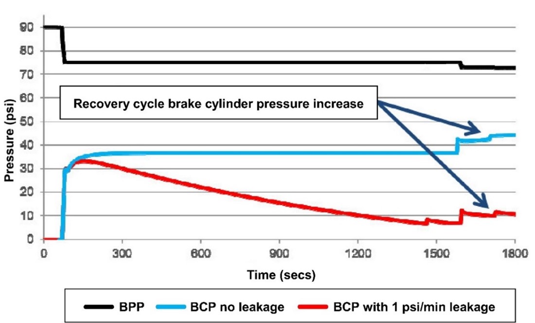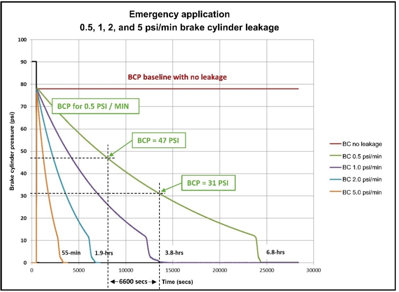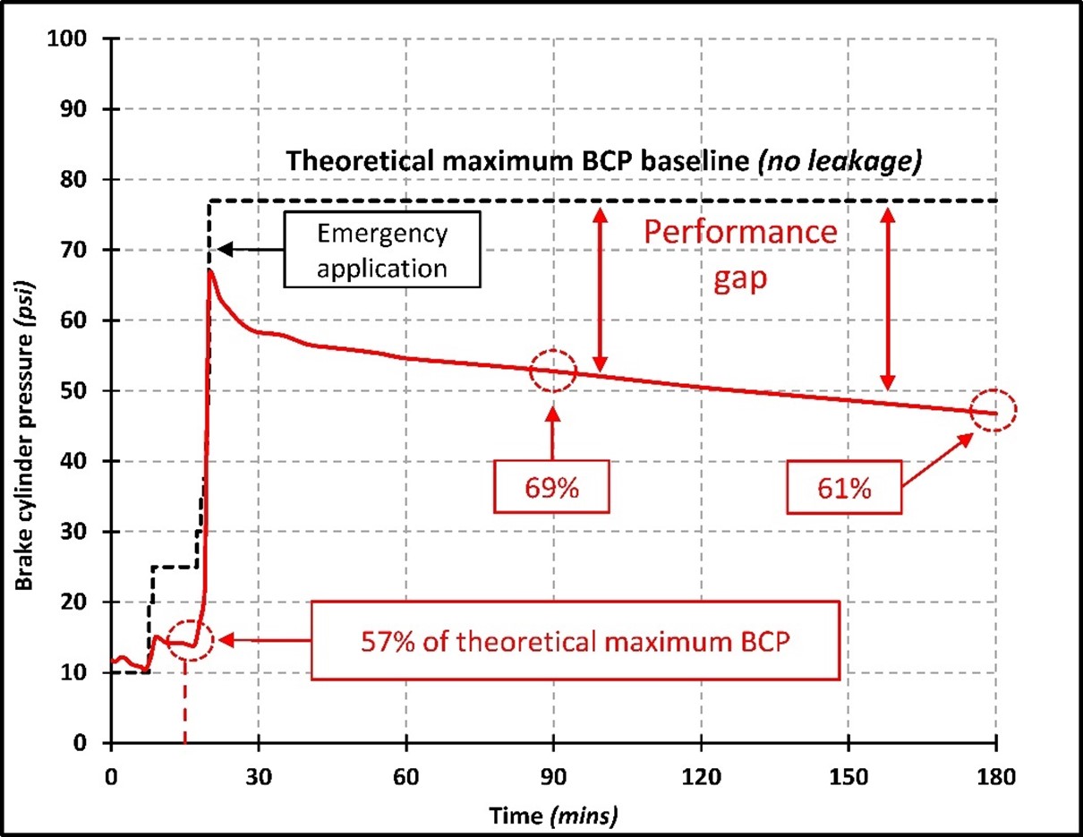 Several factors contributed to the degradation of the occurrence train’s braking performance, especially the leakage of compressed air from the air brake cylinders on the rail cars, which was aggravated by the extreme cold temperatures. If leakage is excessive, or interferes with the normal operation of air brake equipment, the brakes may not apply at all, may produce less than the expected amount of retarding force, or may release after a period of time.