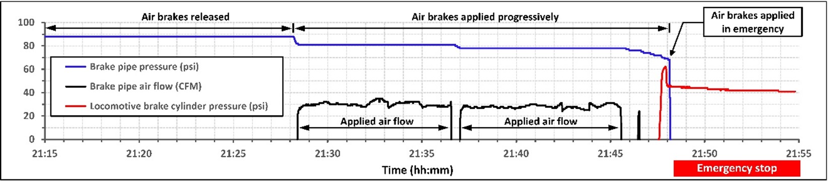 After the train stopped, the air brakes continued to leak over the next 3 hours until they could no longer hold the train.