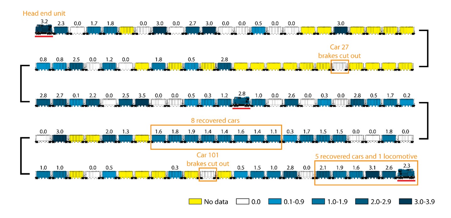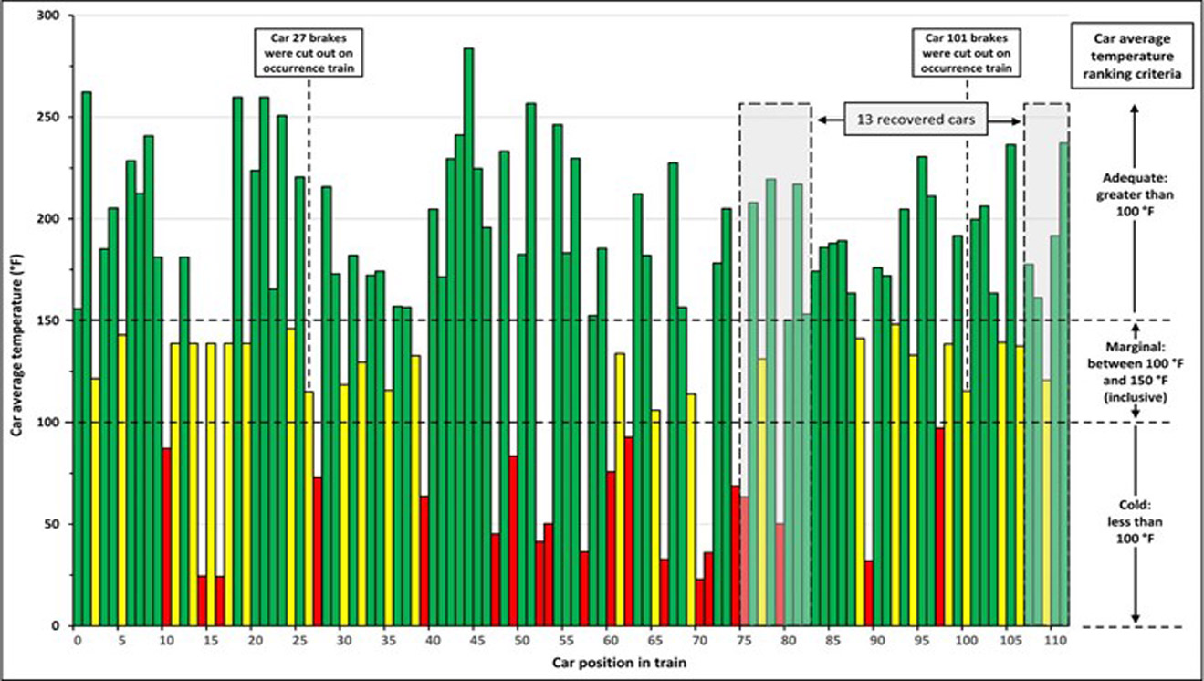 The investigation used several different methods to determine the effectiveness of the brakes at the time of the occurrence, most notably extensive testing of 13 cars recovered from the accident site; review of wheel temperature data for the cars on the train; brake retarding force calculations; and computerized train dynamics simulations.