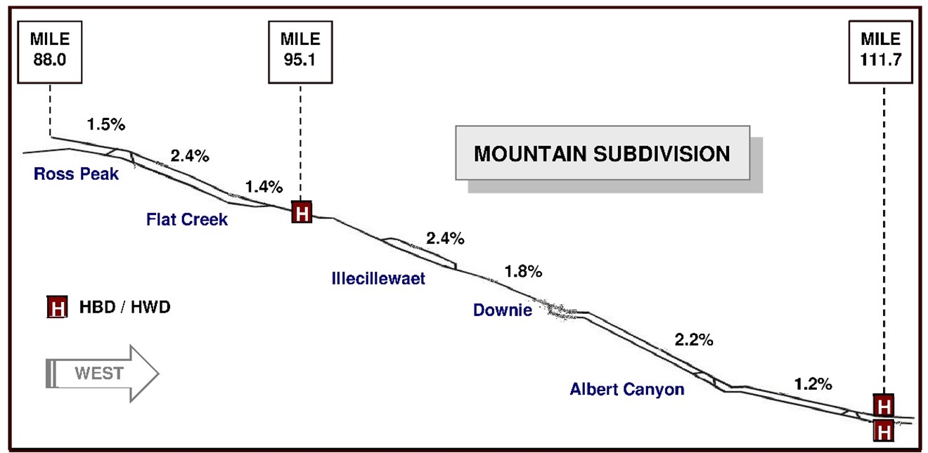 The section of the Laggan Subdivision known as Field Hill runs 13.5 miles from Stephen to Field. It is designated as mountain gradeFootnote 7 and drops from an elevation of 5290 feet at Stephen to 4045 feet at Field. The descending grade varies between 1.7% and 2.2%.