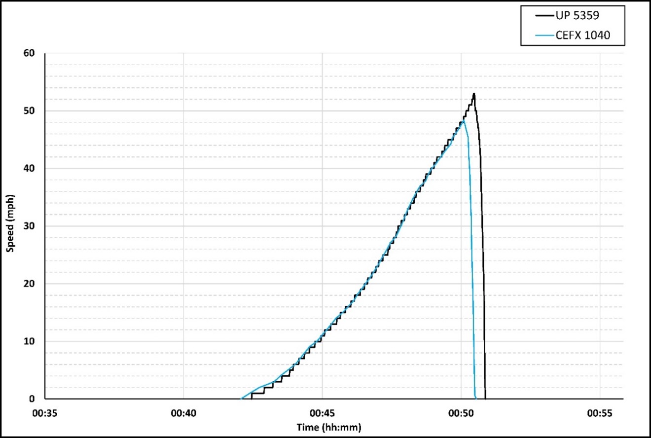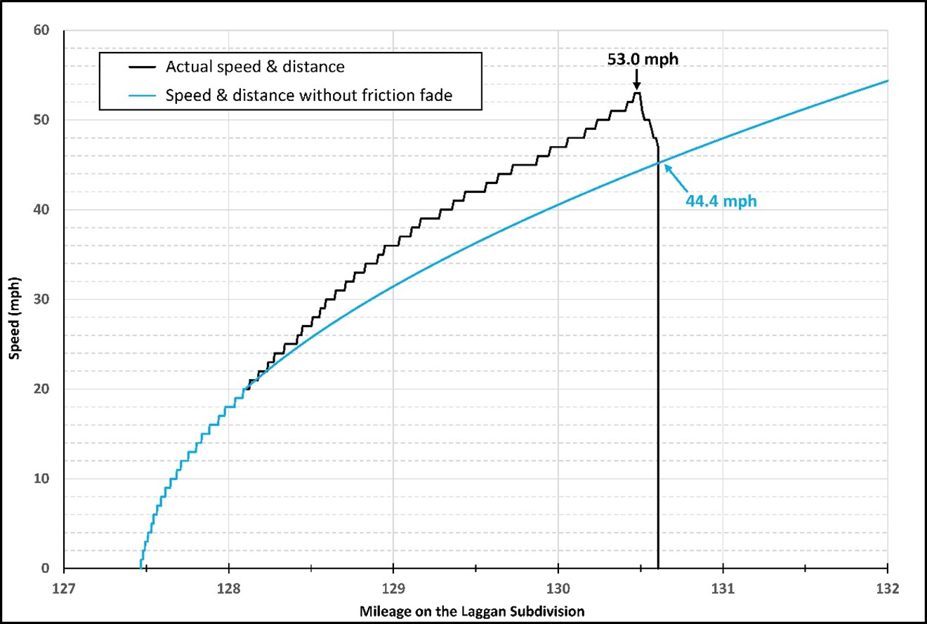 At 0042, before the relief crew were able to start that process, the train began to creep forward, gradually accelerating uncontrolled down the steep grade. The train was able to proceed over back-to-back reverse curves as its speed reached 53 mph, but it was not able to negotiate the sharp 9.8° curve immediately before the Kicking Horse River bridge. Two locomotives and 99 cars derailed, beginning at Mile 130.6.