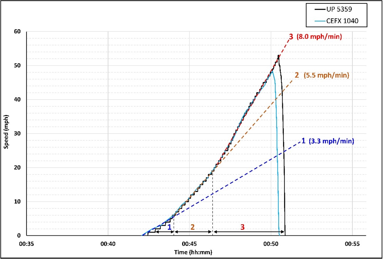 The results all indicated that on the descent of Field Hill before the emergency stop the brake effectiveness of the train was in the 60% to 62% range. After the train had been stationary on Field Hill for approximately 3 hours, the brake effort had degraded to less than 40% of the theoretical maximum braking effort.
