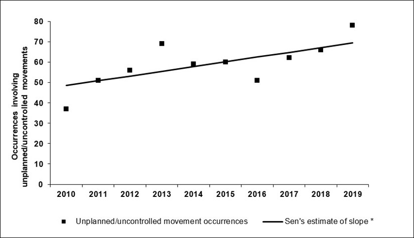 This occurrence is one of 589 occurrences reported to the TSB from 2010 to 2019 that were related to unplanned and uncontrolled movements among all railways in Canada. Loss of control, as in this occurrence, was the causal category in 22 (4%) of them. While uncontrolled movements due to loss of control are low-frequency events, 59% of them (13 out of 22) affected the main track.