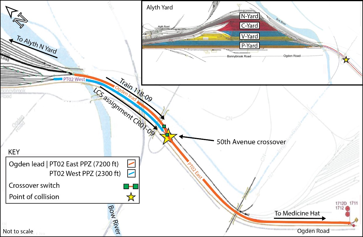 At approximately 0905Footnote 1 on 09 March 2019, eastbound Canadian Pacific Railway (CP) distributed power freight train 118-09 was departing Alyth Yard in Calgary, Alberta, at approximately 10 mph when it was struck by eastbound locomotive control system (LCS)Footnote 2 yard assignment CR01-09 at the 50th Avenue crossover, Mile 172 of the CP Brooks Subdivision. The train and the yard assignment both derailed upright (Figure 1). As a result of the collision, 5 cars and 2 locomotives of the yard assignment derailed, as did 4 cars and 1 locomotive of the train. There were no injuries and there was no release of dangerous goods. The weather was clear and the temperature was approximately −4 °C.