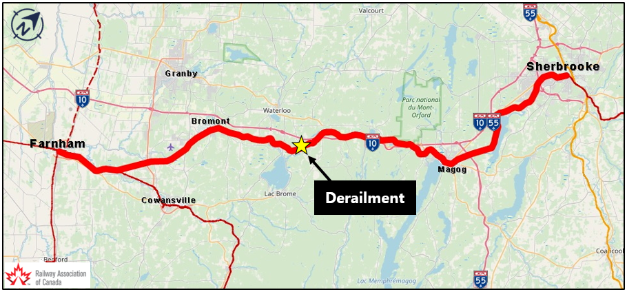 On 16 November 2019, a Central Maine & Quebec RailwayFootnote 1 (CMQ) train crew was called for 1400Footnote 2 at Sherbrooke, Quebec. The crew was scheduled to operate freight train 630 westward, from Sherbrooke (Mile 68.5 of the Sherbrooke Subdivision) to Farnham, Quebec (Mile 6.3 of the Adirondack Subdivision). The required pre-departure inspections were completed with no defects noted, and the train departed at about 1445.