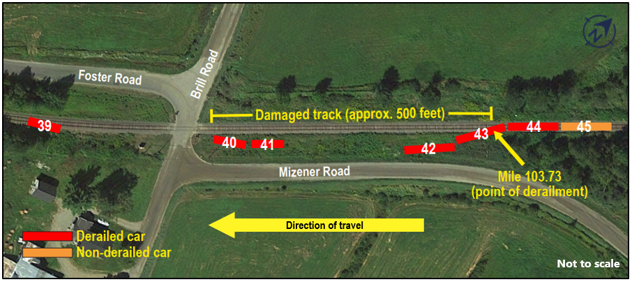 The 39th car was the first to derail. It was upright, still partly on the track, approximately 225 feet west of the Brill Road crossing. The 40th and 41th cars were lying on their sides, approximately 50 feet from the east side of the crossing. The 42nd car was lying on its side, below the right-of-way. The 43rd car was standing across the track and was still coupled to the next car (the 44th car), which was upright on the track. The 45th car, the last car of the train, was upright and had not derailed (Figure 2). The first 3 cars that derailed were boxcars loaded with rolls of paper, and the last 3 cars were centerbeam flat cars loaded with lumber.