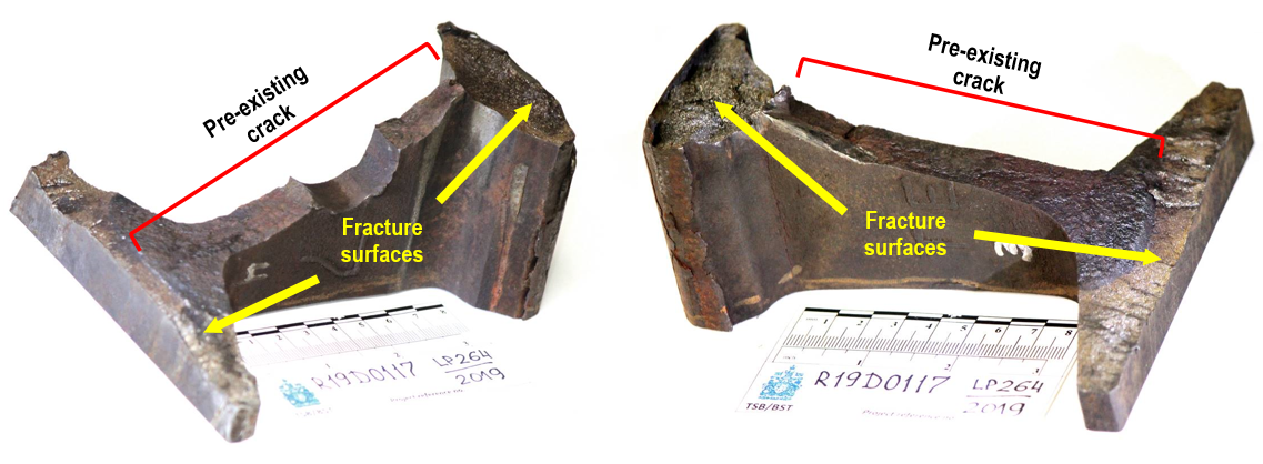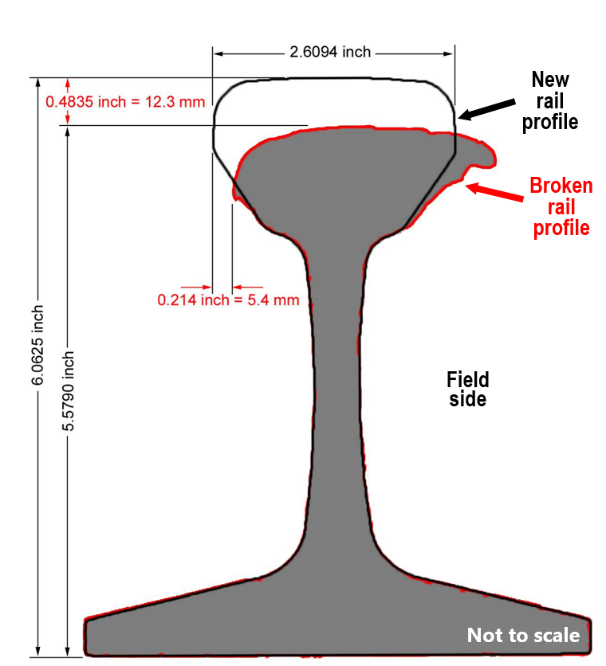 A 20-inch piece of the broken rail, as well as the 9-inch fragment found among the debris, were sent to the TSB Engineering Laboratory for examination.