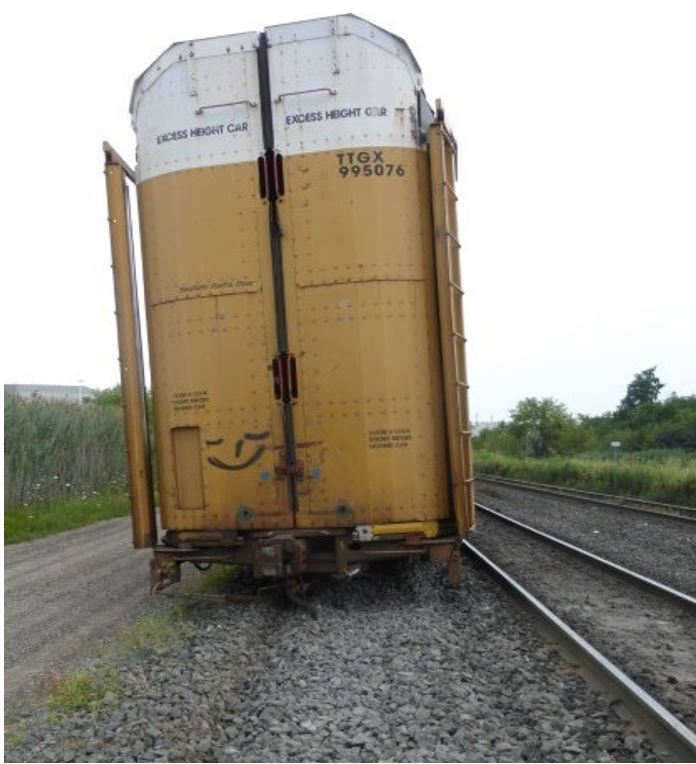 The 26th car, empty autorack car TTGX 995076, had derailed but came to rest upright. The leading A-end truck did not derail but all 4 wheels of the trailing B-end truck were derailed in the ballast on the west side of the track, just north of the W100 switch (Figure 5). As the car came to rest, it struck and damaged the W100 switch. The remainder of the head-end cars were inspected with no defects noted.