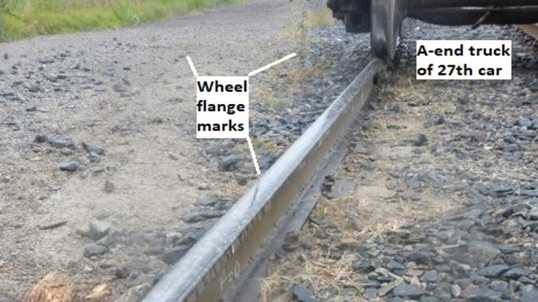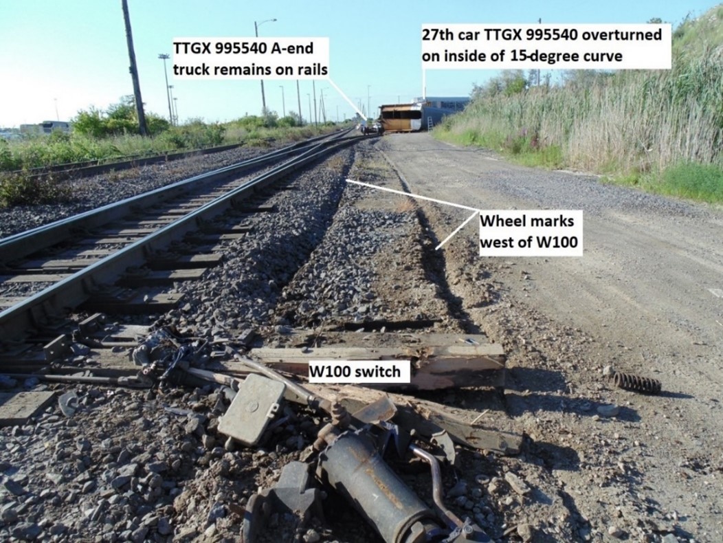 From the W100 switch, wheel marks were observed in the ballast extending southward for about 400 feet. The marks in the ballast stopped near the leading end of the 27th car, TTGX 995540. The leading A-end truck of TTGX 995540 remained intact, did not derail and rolled along the track clear of the car. It came to a stop on the rails about 40 feet north of the car (Figure 6).