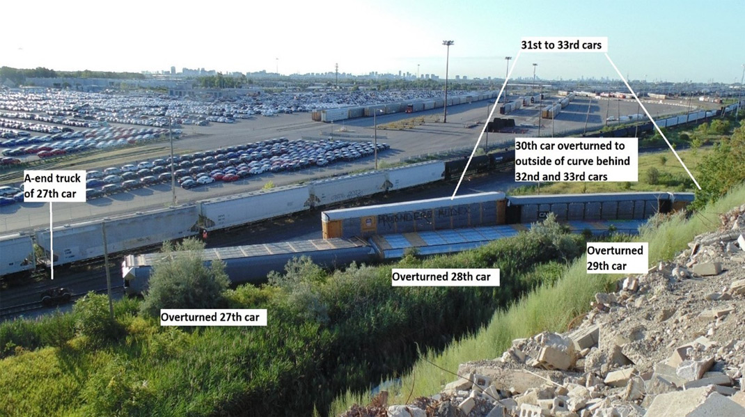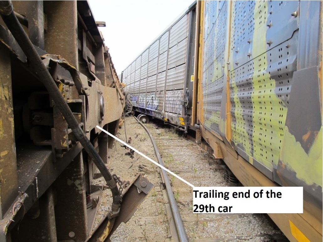 The trucks of the 28th and 29th cars were strewn about the site by the trailing cars as they derailed. The 29th car had separated from the 30th car. The 30th car had overturned and came to rest on the outside of the curve, parallel to the track.