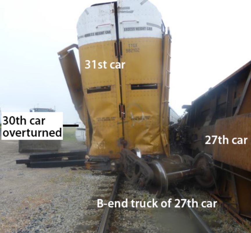 The A-end truck of the overturned 27th car (TTGX 995540) rolled clear of the car and came to a stop on the track just north of the car. The B-end truck of the 27th car was generally intact but was impacted by the leading end of the 31st car (TTGX 982102) during the derailment. The B-end truck of the 27th car came to rest just ahead of the 31st car, which was adjacent to the B-end of the 27th car (Figure 9).