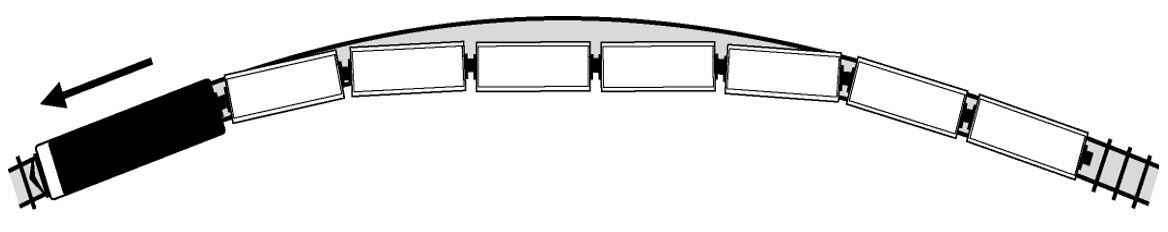 When a train is pulled through a curve, draft (tension) forces tend to stretch or “string-line” the train as wheel flanges are pulled taut against the inside rail of the curve. If the draft force generated by the locomotives is excessive or if there is a significant run-out of train slack, the L/V ratio can reach a critical level that results in a car wheel climbing, or lifting, onto the head of a rail and subsequently derailing.