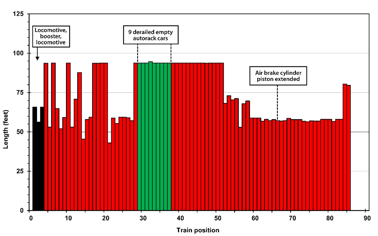 | Incident train: 2 locomotives, 1 slug, 82 cars, 6574 tons | Actual track: Actual handling based on event recorder | 27 (24) | 0.35 | 0.42 | 0.29 | 0.18 | 0.32 | 0.30 | 0.35 | 0.45 | 0.21 | 0.12 | 0.28 | 0.29 |
