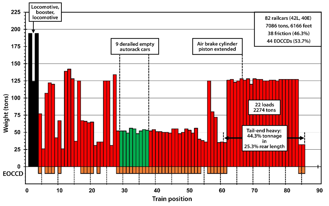 At the time, unbeknownst to the yardmaster, the yardmaster trainee, and the YOE, the cut of 34 loaded cars that had been recently added to the south end of the autorack cars placed 44% of the assignment’s weight in the rear 25% of its length, making it “tail-end heavy.”