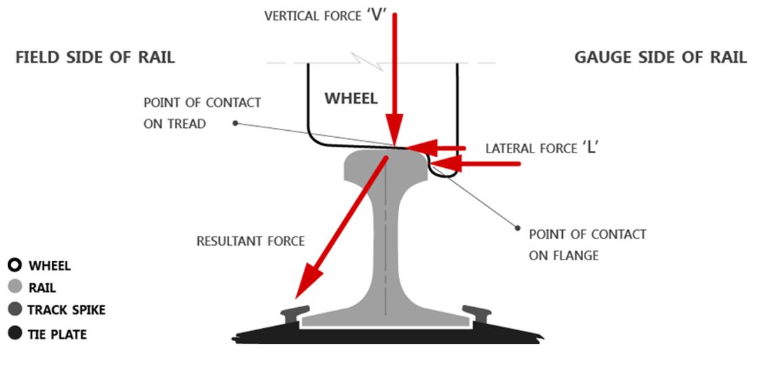 A combination of lateral (L) and vertical (V) forces exists at the wheel-rail interface. The ratio of lateral-to-vertical (L/V) forces indicates the potential for a derailment to occur. When a high lateral force and low vertical force are present (e.g., as with an empty car), the high lateral force will tend to push the wheel flange up and over the gauge face of the rail, resulting in a wheel-climb derailment.