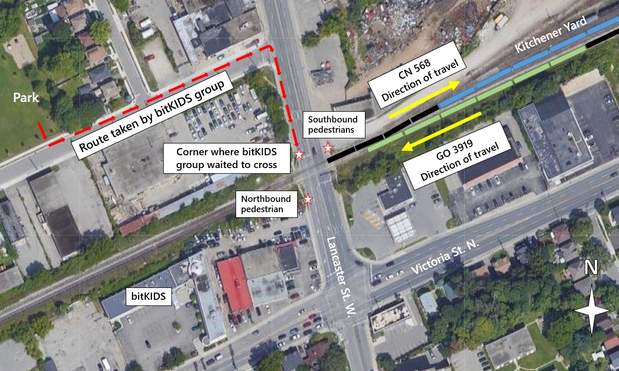 At about 1444Footnote 1 on 13 November 2019, while returning from a nearby park to their clinic on Victoria Street North in Kitchener, Ontario, a group of pedestrians (6 adult therapists and 5 child clients) from bitKIDS Behaviour Consulting (bitKIDS) encountered activated automatic grade crossing warning devices (GCWD) at the Lancaster Street West public crossing. The activated GCWD consisted of flashing lights, bells, and gates that extended across each side of the roadway, but not the pedestrian walkways.