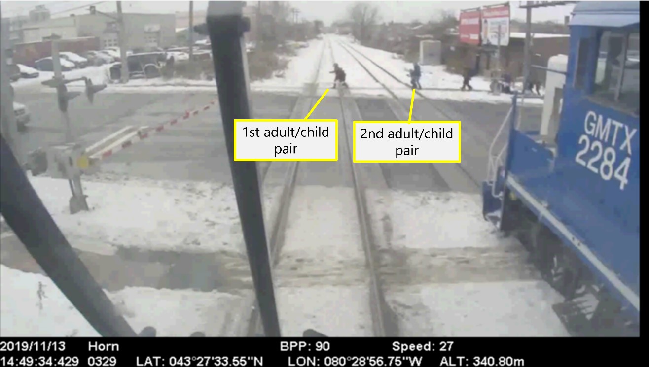 - The 1st adult and child pair of the group proceeded successfully to the south side of the crossing, unaware that GO 3919 was approaching from the east until they heard its train horn sound to signal an emergency.