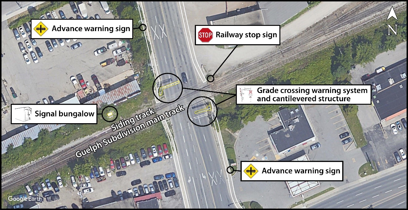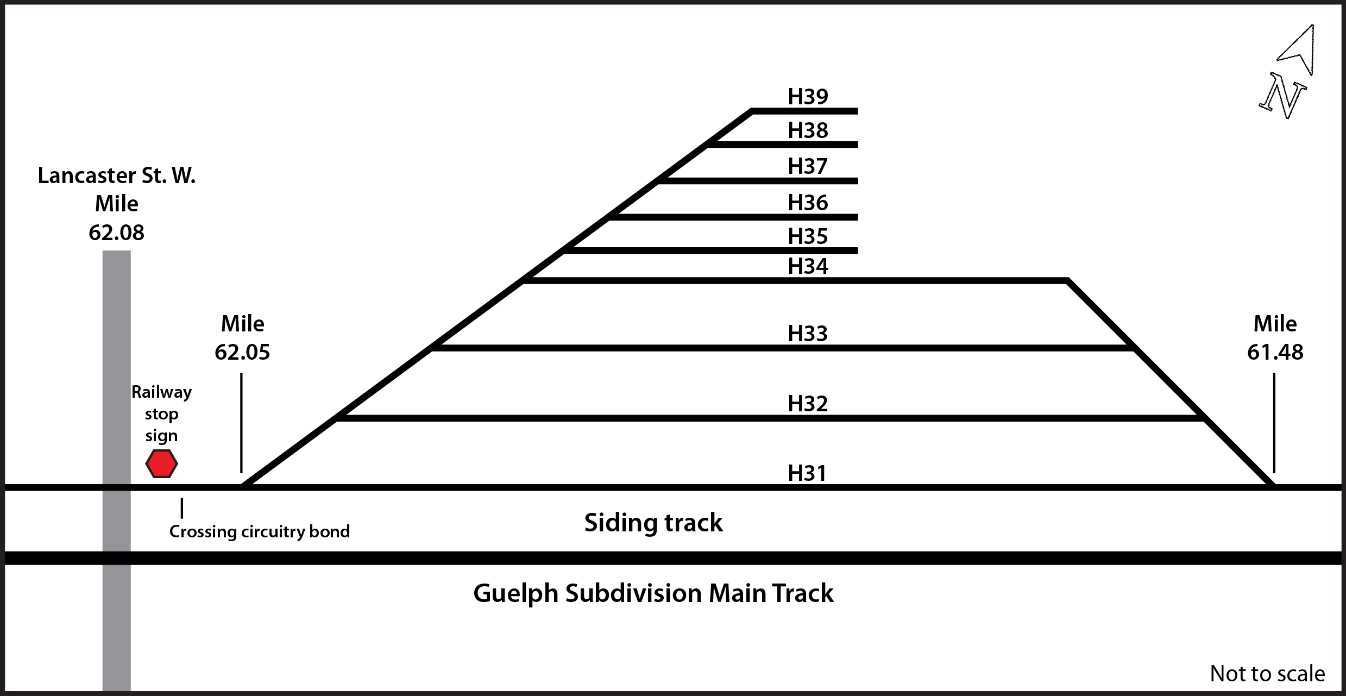 At this location, Lancaster Street West crosses 2 sets of railway tracks, both owned by Metrolinx: the south track is the Guelph Subdivision main line, and the north track is a siding. The lead track to Canadian National Railway Company’s (CN) Kitchener Yard joins the siding at Mile 62.05.
