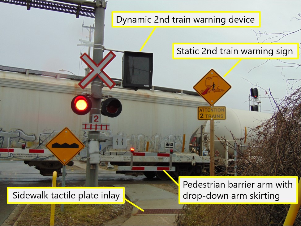 - dedicated sidewalk pedestrian barrier arms, sidewalk tactile plate inlays for visually challenged pedestrians;
