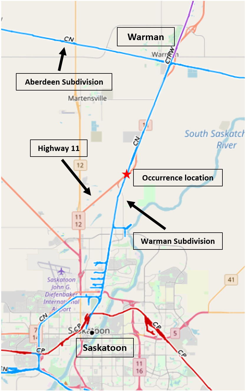 The train continued eastward until it reached Warman, Saskatchewan, where it entered the Warman Subdivision at Mile 17.2 (Mile 65.4, Aberdeen Subdivision) and travelled southward. At about 0923, a rough ride was experienced as the train approached and then passed over the Highway 11 crossing at Mile 11.35. At about 0924, a train-initiated emergency brake application occurred. The head end of the train came to rest at Mile 10.81.