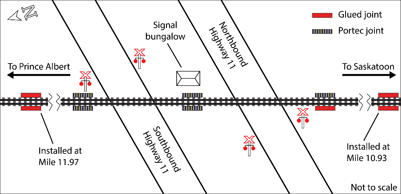 In addition to these insulated joints, a number of regular joints had been installed in the section of track between the northbound and southbound lanes of Highway 11 during previous track repairs.
