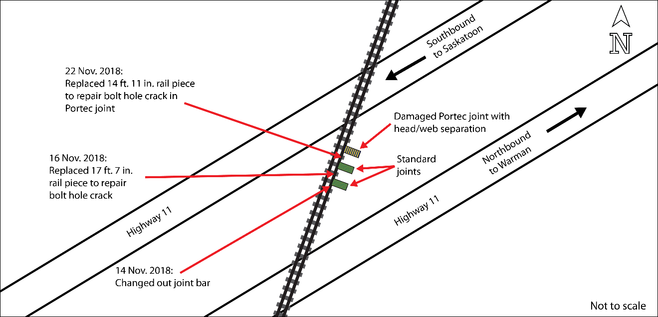 - On 16 November 2018, the rail with the bolt hole crack was changed out. A piece of rail 17 feet and 7 inches in length was installed between the joint and a joint to the south.