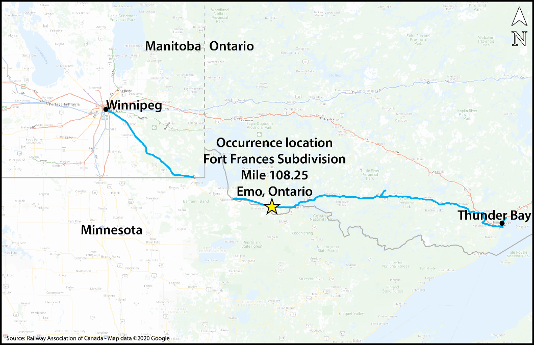 On 18 February 2020, a Canadian National Railway Company (CN) operating crew was ordered for 1600 Central Standard TimeFootnote 1 in Winnipeg, Manitoba, for train X35041-18. The key trainFootnote 2 was to operate on a key routeFootnote 3 eastward from Winnipeg to Fort Frances, Ontario, on CN’s Sprague and Fort Frances subdivisions. The train crew consisted of a locomotive engineer and a conductor. Both crew members were qualified for their positions, met fitness and rest requirements, and were familiar with the territory.