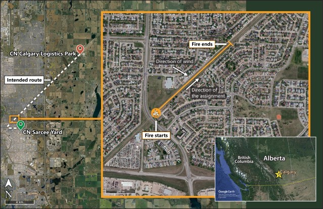 Map of the occurrence location showing the intended route of the train, with an inset map showing the location of the grass fires on the right-of-way and a smaller inset map showing the location of the city of Calgary in Alberta (Source: Google Earth, with TSB annotations)