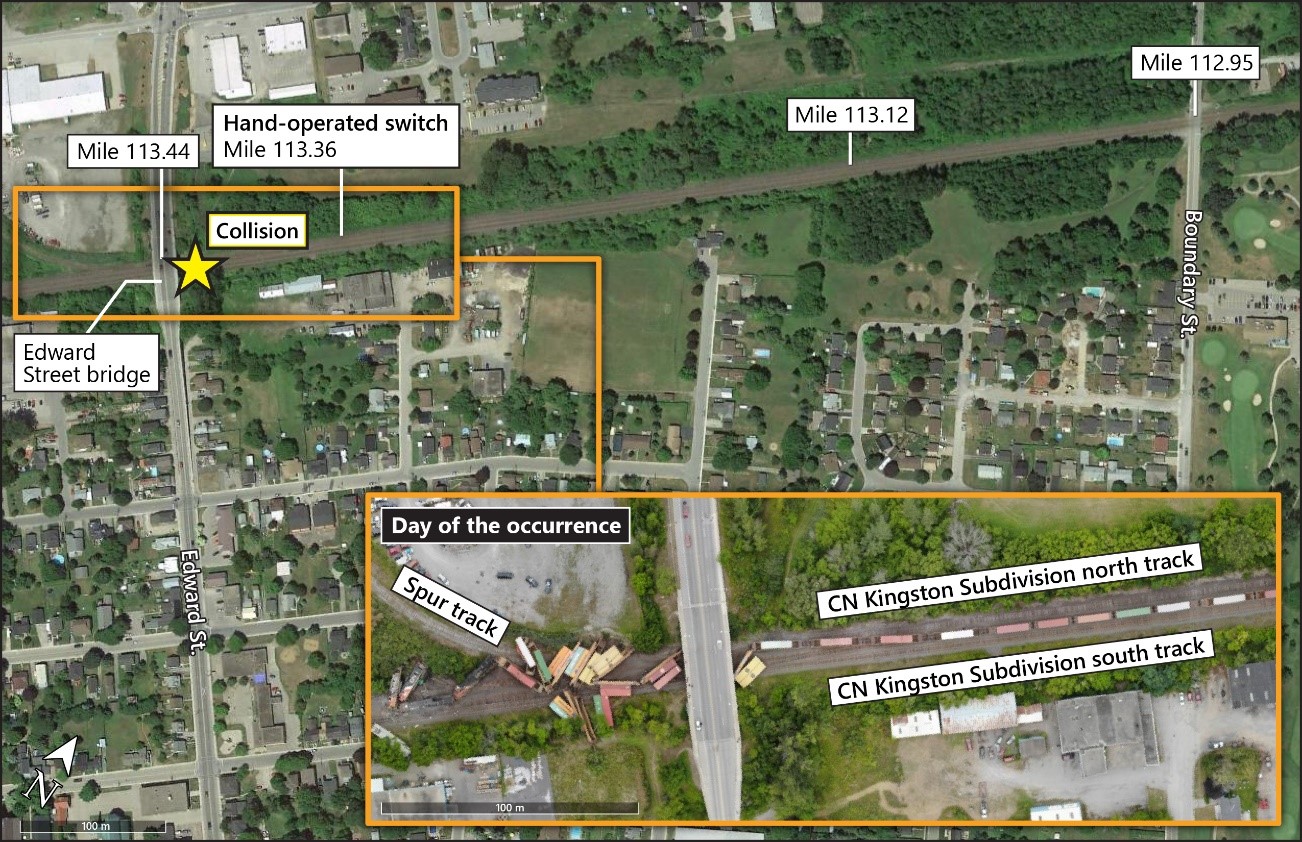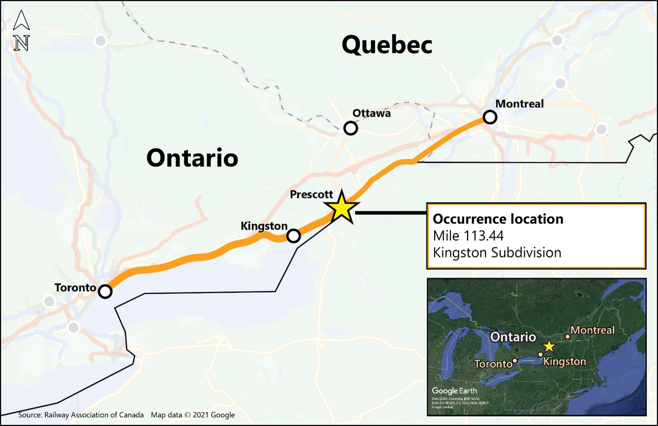 On 02 September 2021 at about 1028,Footnote 1 Canadian National Railway Company (CN) intermodal train Z14921-02 (train 149) was proceeding westward on the north main track of the Kingston Subdivision where a hand-operated switch provides access to an industrial spur track in the town of Prescott, Ontario.