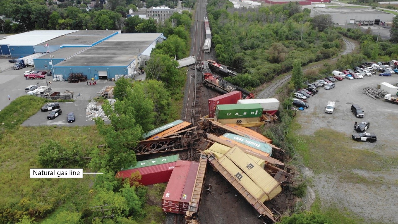 Derailed intermodal car and container near a natural gas line (Source: Ontario Provincial Police, with TSB annotations)