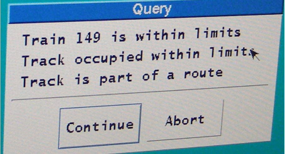 When the RTC initiated the process to issue a Rule 568 permission to train 532, the RTC II software displayed a prompt indicating that train 149 was within track limits. This prompt presented 2 options: Continue (the default option) or Abort. Since the RTC was already aware that train 149 was in the block, he incorrectly assumed that it was west of the switch at Mile 113.36, chose not to obtain a location report, and selected “Continue.”