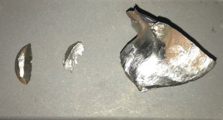 The 39th car, IC 21013,Footnote 4 was still on the track. Its axles, trucks and brake beams had sustained minimal damage. The cross keyFootnote 5 retaining the coupler in the draft assemblyFootnote 6 at the leading end (A-end) of this car had sheared, leaving 3 small fragments (Figure 3) in the yoke.