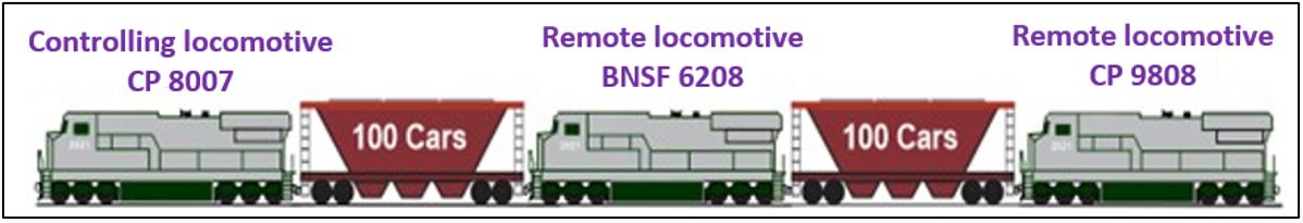 The train was set up to operate in a 1-1-1 distributed power configuration composed of head-end controlling locomotive CP 8007, 100 loaded covered hopper freight cars, mid-train remote locomotive BNSF 6208, another 100 loaded covered hopper cars, and tail-end remote locomotive CP 9808 (Figure 1).