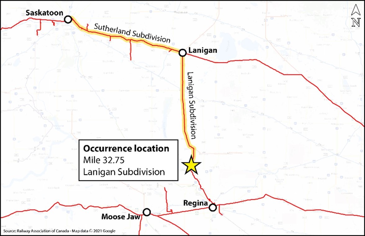 On 15 October 2021, a Canadian Pacific Railway Company (CP)Footnote 1 train crew was ordered for 2245Footnote 2 in Saskatoon, Saskatchewan, to operate unit trainFootnote 3 603-897 (the train) from Sutherland Yard (Saskatoon) to Regina, Saskatchewan, via the Sutherland and Lanigan subdivisions. The train crew consisted of a locomotive engineer and a conductor. Both crew members were qualified for their respective positions, met fitness and rest requirements, and were familiar with the territory on which they operated.