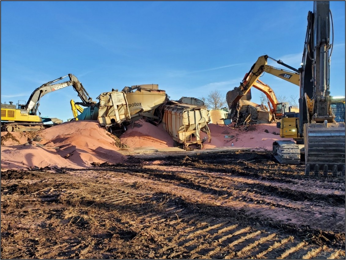 Following the TSB site inspection, the derailed rolling stock was pushed to the side and the track was reconstructed. The track reopened to train operations at 0300 on 17 October 2021. Site remediation and removal of the derailed rolling stock was completed on 27 October 2021.