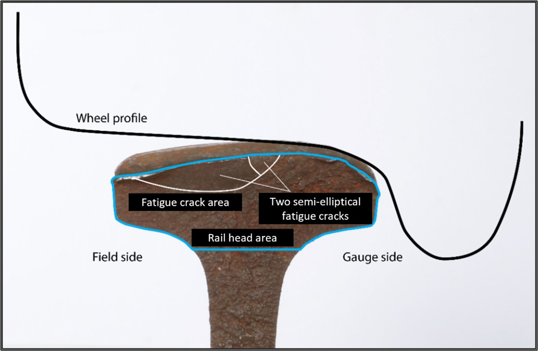The west rail broke under normal service conditions when pre-existing fatigue cracks, representing about 15% of the total area of the rail head, propagated down to the base of the rail in a sudden overstress.