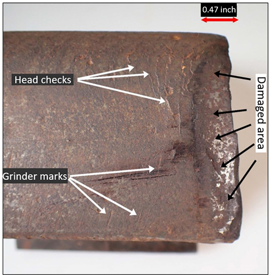 The top view of the rail running surface displayed minor head checks on the gauge side of the head and rail grinding marks on the field side of the head. There was impact damage, likely due to contact with freight car wheel treads, that extended across the rail head running surface, but there was no widening (horizontal expansion) of the rail head (Figure 8).