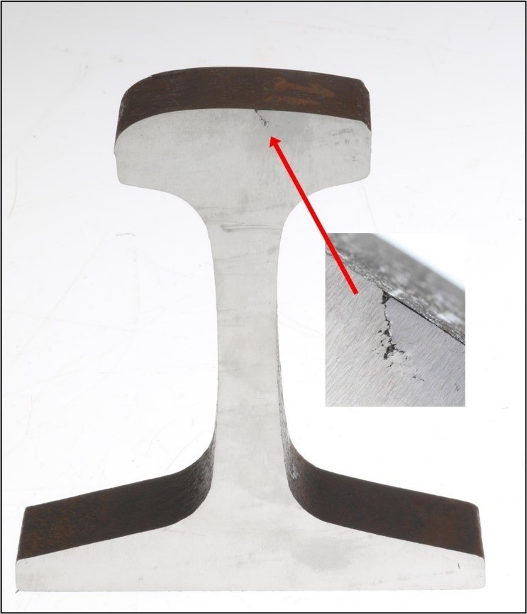 Subsequently, Rail 1 was cut vertically about 1.2 inches (30 mm) away from, and parallel to, the fracture surface. On the cut surface of the cross-section, a small vertical crack was observed extending from the rail running surface to a depth of about 0.24 inch (6 mm) (Figure 9).