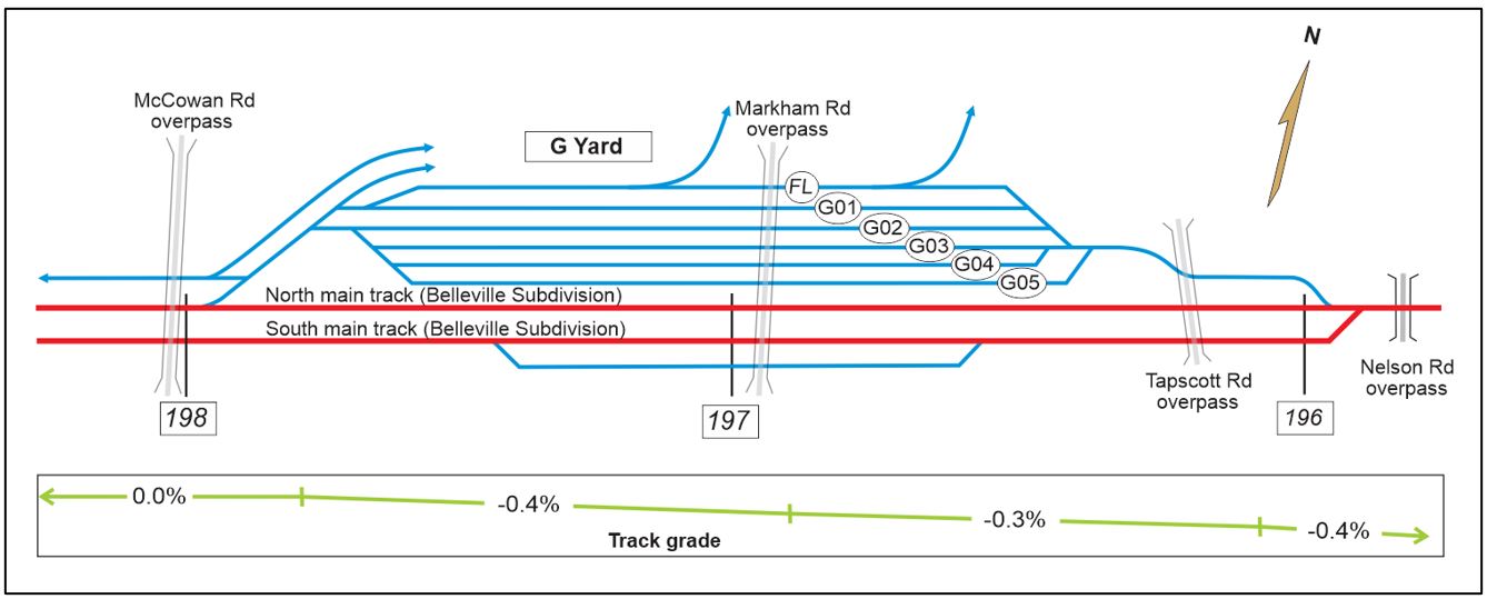 Upon entry into Toronto Yard from the north main track at Mile 196.7 of the Belleville Subdivision, rail traffic is pulled westward and placed into one of 5 tracks in G Yard (Figure 1). Rail traffic is then redistributed into other destination tracks where trains are built in preparation for further handling and departure.