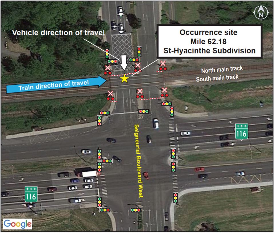 The train, travelling east on the north main track, had just left Saint-Bruno Station (Mile 63.8) in Saint-Bruno-de-Montarville, Quebec. At approximately 1758,Footnote 2 the train was approaching the public crossing at Seigneurial Boulevard West (Mile 62.18) at a speed of 62 mph (Figure 1).