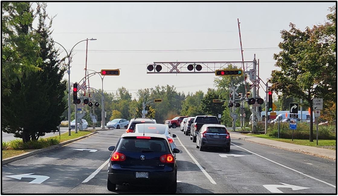 The grade crossing is located in the immediate vicinity of the intersection of Route 116 Footnote 4 and Seigneurial Boulevard West Footnote 5—two high-volume roads. This intersection features a complex array of road and rail signage. The traffic lights and the grade crossing warning devices are interconnected (Figure 3).