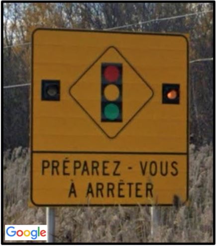 The traffic lights at this intersection are interconnected with the detection systems installed on the track. As a result, trains approaching the grade crossing are detected at least 25 seconds before the grade crossing’s automatic warning devices are activated. The traffic lights then go into advance pre-emption mode in a specific sequence to clear traffic before the grade crossing warning system is activated. One of the features of this system is that it activates the flashing yellow lights of the advance signs warning motorists on Route 116 to prepare to stop. These signs are located approximately 250 m on either side of the intersection with Seigneurial Boulevard West (Figure 4).
