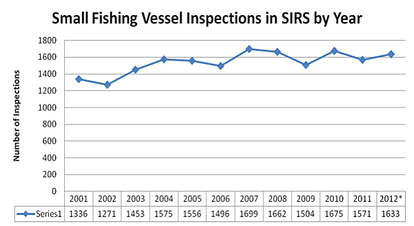 Overall, the data shows that there has been a general increasing trend in the number small fishing vessel inspections by Transport Canada Marine Safety Inspectors over the period of the data (this includes both periodic and intermediate inspections). For comparison, an annual average of 1353 inspections by Transport Canada marine safety inspectors took place in the first few years of the previous decade (2001 to 2003), while in the current decade (2010 to 2012) the annual average number of small fishing vessels inspections has risen to 1626, which is almost 300 inspections more per annum. That roughly translates into a 20% increase in the number of small fishing vessel inspections in 2012 compared with decade ago. This data therefore indicates, in quantitative terms, that Transport Canada has given increased inspection attention to small fishing vessels.