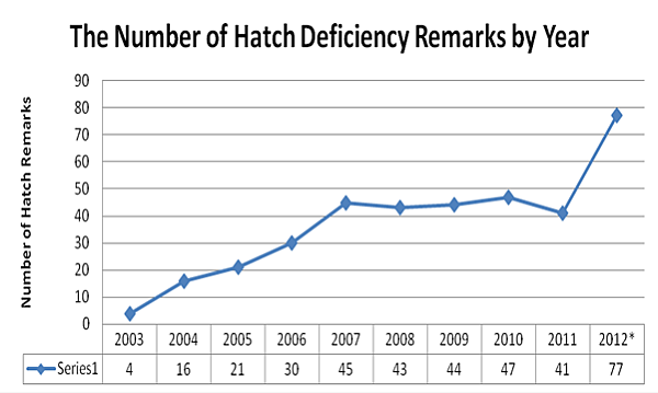 Since 2003, 390 remarks have been entered in SIRS specifically related to small fishing vessel hatches. In 2003 only 4 entries were made. In the following years the number of entries each year has grown steadily, with a significant jump in 2007 (which coincides with the release of the Ship Safety Bulletin #12/2007 referring to hatches). The years 2007 to 2011 remain relatively steady at around 44 remarks entered annually. In 2012* a dramatic 87% increase in remarks were entered (jumping from 41 to 77). This may be attributable to the increased focus on SIRS data entry that Flag State Inspection Standards has taken over the past few years. Overall this graph shows a definite and unmistakable increasing trend in the use of the hatch deficiency field by inspectors since the Brier Mist sinking.