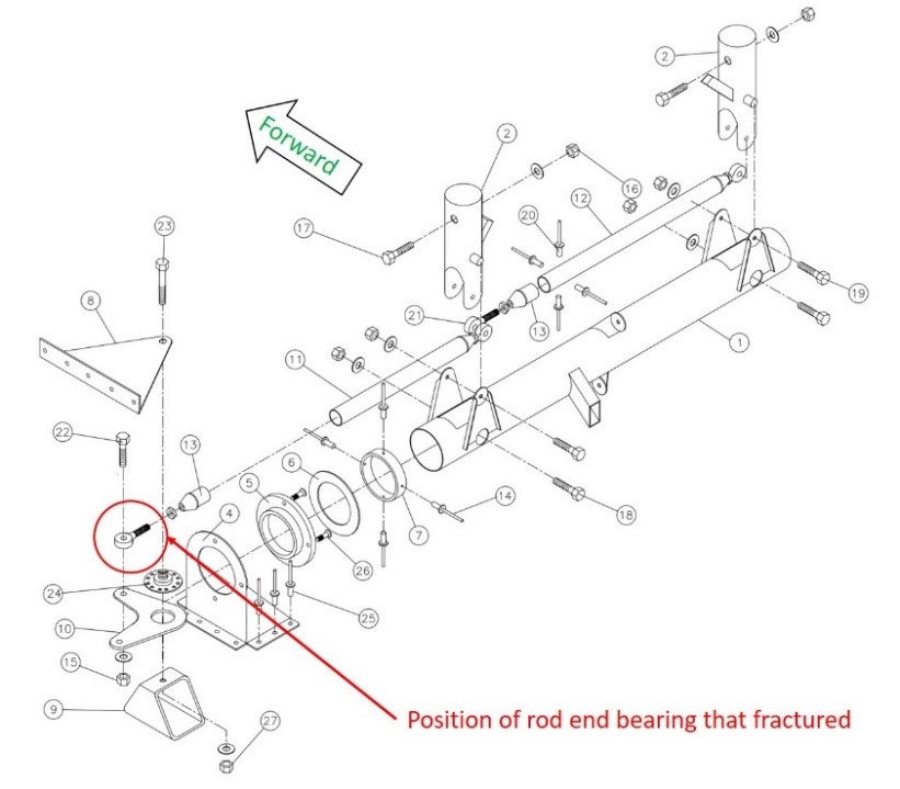 The rod end bearing fractured at the last root, outboard of the jam nut, due to the combination of the misalignment and the transverse forces encountered from this interference contact. In normal operation, the rod end bearing is loaded only along the push tube longitudinal axis.