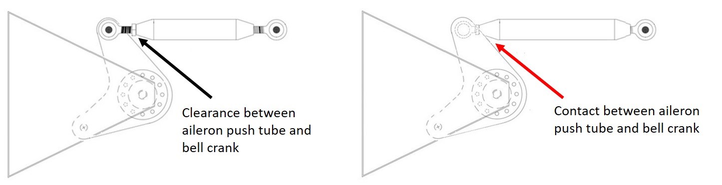The occurrence rod end bearing had been threaded completely into the aileron push tube assembly, which resulted in the jam nut contacting the bell crank when the push tube was moved outboard during full range aileron control inputs in that direction. In addition, the push tube rod end bearing had been mounted on the underside of the bell crank. This position was contrary to the manufacturer’s drawing, which shows the push tube rod mounted on top of the bell crank.